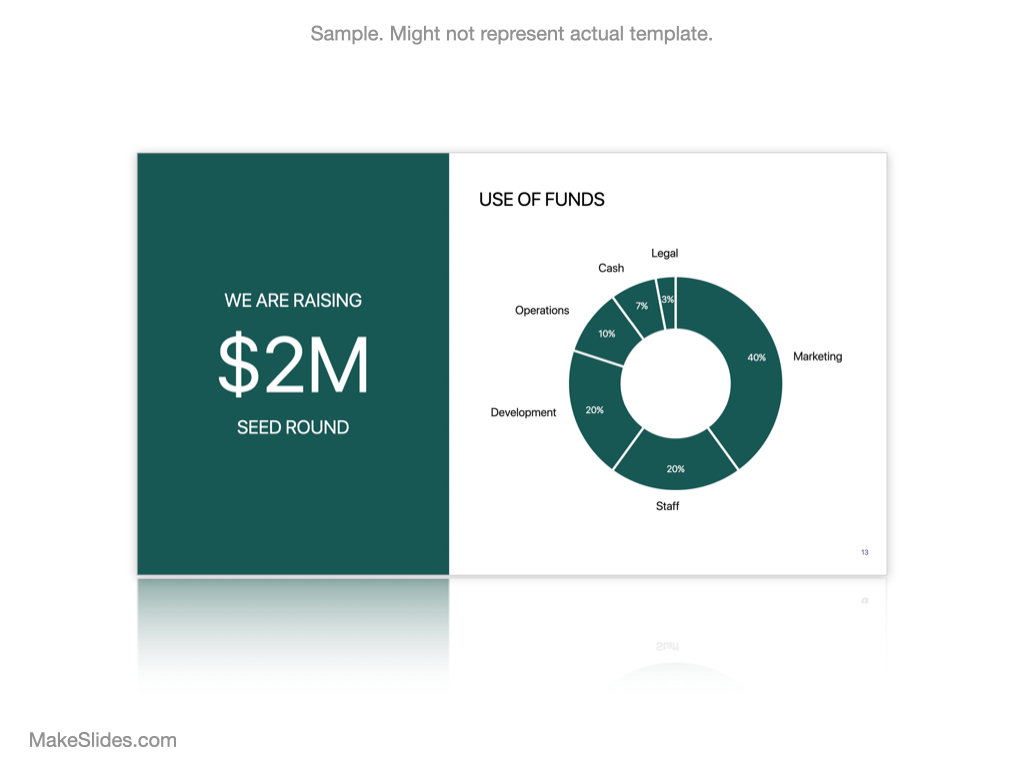 Conclude with a clear ask for funding. Specify the amount you're raising and how you intend to allocate it, whether for product development, marketing, hiring, or scaling operations.